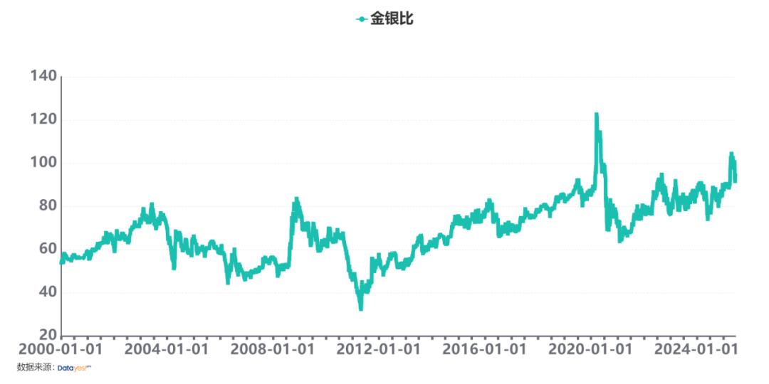 業(yè)內(nèi)經(jīng)常提及的“金銀比”,指的是每盎司黃金價(jià)格與每盎司白銀價(jià)格的比值,它與“銅金比”“銅油比”等比價(jià)關(guān)系類似,是從商品維度觀察經(jīng)濟(jì)預(yù)期、流動(dòng)性的領(lǐng)先性指標(biāo)。通常情況下,“金銀比”圍繞一個(gè)中樞做周期波動(dòng):當(dāng)避險(xiǎn)需求強(qiáng)于經(jīng)濟(jì)預(yù)期時(shí),黃金走勢強(qiáng)于白銀,“金銀比”走高;當(dāng)經(jīng)濟(jì)預(yù)期相對強(qiáng)于避險(xiǎn)需求時(shí),白銀工業(yè)屬性定價(jià)權(quán)重放大,銀價(jià)彈性釋放,同時(shí)黃金作為不生息資產(chǎn)吸引力邊際走弱,“金銀比”實(shí)現(xiàn)修復(fù)。