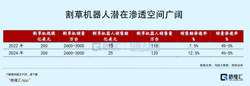 根據機構,在割草機市場中,當下割草機器人行業規模達到了25億美元,銷售額滲透率僅12.5%,銷量滲透率4-5%。
