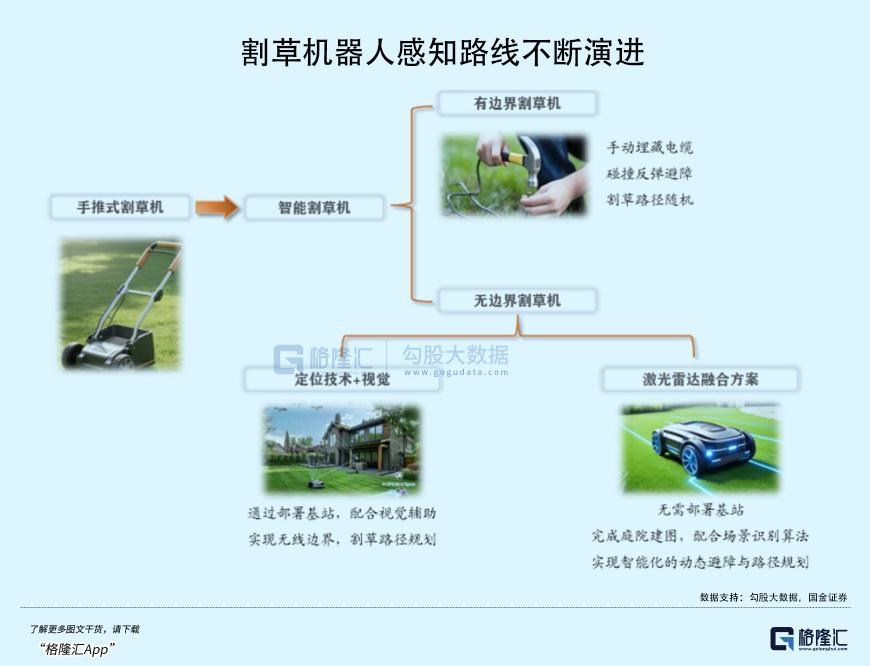 傳統的手推式和騎乘式割草機每年出貨量大約在1150萬臺左右,痛點在于人力和時間成本,引入智能割草機器人,本質就是改造割草場景并實現自動化,掃地機器人就是一個近似的參照。