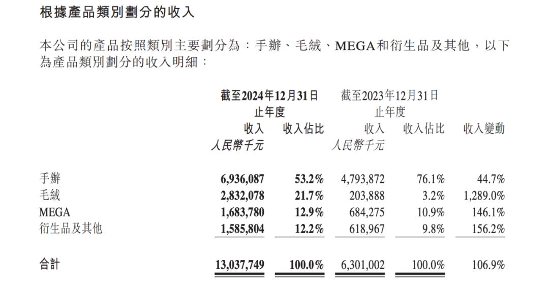 其次是品類結構的拓寬,Labubu從手辦轉向可佩戴、易攜帶搪膠毛絨掛件后,帶動了毛絨品類營收暴增1289%。該品類的營收占比也從第四提升至第二位,僅此于手辦品類。