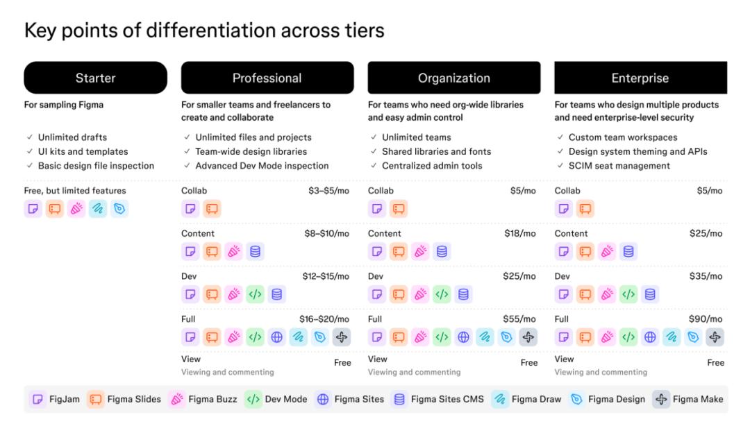 Figma 的商業模式看似簡單,實則精巧:基于“座席”訂閱,按使用角色和功能模塊靈活計費,支持按月或按年支付,既適配初創小隊,也撐得住大型企業的復雜需求。