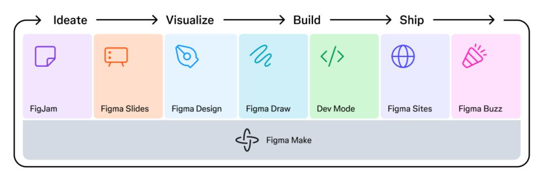 過去四年,Figma已推出 7 款新產品,從從一個設計協作工具,演進為覆蓋從構思(Ideate)— 可視化(Visualize)— 構建(Build)— 發布(Ship)的全鏈路產品開發系統。截至 2025 年 Q1,已有 76% 客戶使用兩款以上產品。