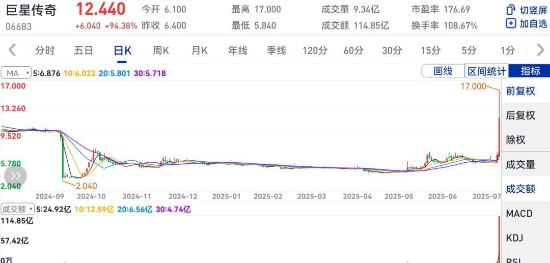 昨日,巨星傳奇(06683.HK)小幅低開,到11點多,突然快速拉升,盤中最高漲幅一度超過160%。全天收于12.440港元/股,上漲94.38%,總市值106.9億港元,一天上漲了約50億港元。全天交易額達114.8億港元。