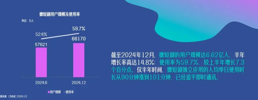 有行業(yè)機(jī)構(gòu)預(yù)估,2024年我國(guó)微短劇市場(chǎng)規(guī)模將達(dá)504.4億元,呈現(xiàn)穩(wěn)步增長(zhǎng)態(tài)勢(shì),市場(chǎng)規(guī)模有望首次超越電影市場(chǎng)。而今年3月發(fā)布的《中國(guó)網(wǎng)絡(luò)視聽發(fā)展研究報(bào)告(2025)》顯示,截至2024年12月,微短劇用戶規(guī)模高達(dá)6.62億,半年增長(zhǎng)高達(dá)14.8%。