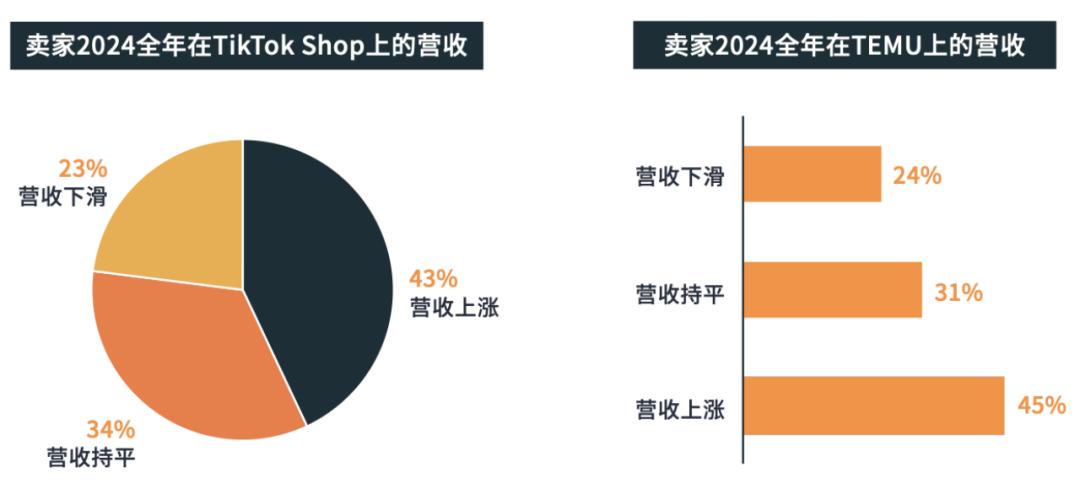 雨果跨境針對612位跨境賣家的調(diào)研顯示,2024年在TikTok、TEMU上,近八成賣家的營收同比上漲或持平。在一些熱賣的跨境電商獨立站,64%的賣家表示2024年在獨立站渠道的利潤高于2023年。