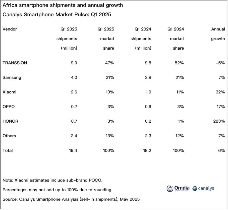 Canalys統計2025年一季度非洲市場手機廠商出貨量以及市場占有率情況