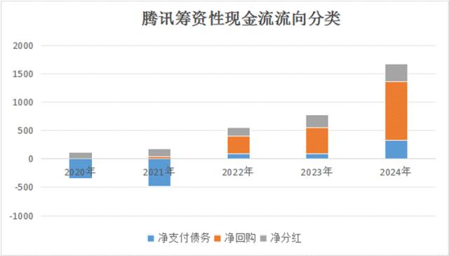 在過去5年中,騰訊的賬面資金正在積極的回饋股東,回購+分紅+償債金額逐年上升,在2024年,騰訊回購分紅和償債的凈總金額達到了1681億,已經是當年資本開支的2倍還要多。