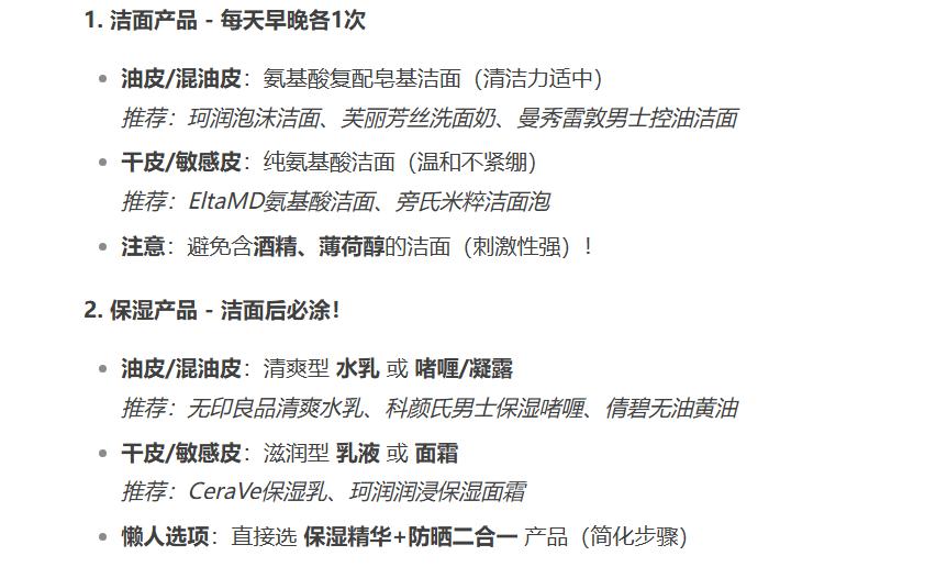 在一長串的回答中,從潔面到保濕再到防曬,每一部分都有著具體的品牌和產品名出現,其中僅僅是潔面產品,就出現了包括珂潤、曼秀雷敦和旁氏等五個品牌。