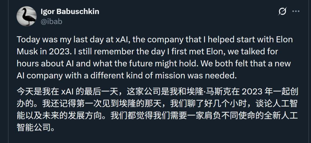 今天是我在xAI的最后一天,這家公司是我和埃隆·馬斯克在2023年共同創(chuàng)立的。我還記得第一次見到埃隆的那天,我們聊了好幾個(gè)小時(shí),談?wù)撊斯ぶ悄芤约拔磥淼陌l(fā)展方向。我們都認(rèn)為,世界需要一家肩負(fù)不同使命的全新人工智能公司。