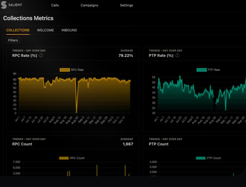 Salient催收模塊的數據看板,聚焦有效客戶觸達和承諾還款兩項