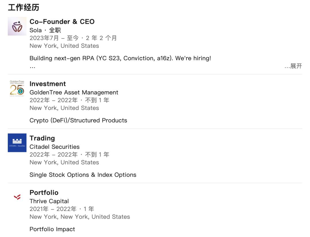 曾在金融領域(如Citadel Securities、Goldentree AM、Thrive Capital等對沖基金)從事風險投資、量化研究和交易工作,在一家價值數(shù)十億美元的對沖基金中做到了最年輕的量化研究員。