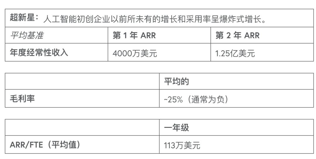 1.兩種 AI 初創(chuàng)企業(yè)原型正在獲勝:平均而言,超新星在 1.5 年內(nèi)達(dá)到約 1 億美元的 ARR,但通常留存率很低且利潤率很低;流星像一流的 SaaS 一樣成長:4 年內(nèi)從 300 萬美元增長到 1 億美元,具有強(qiáng)勁的 PMF 和健康的利潤率。