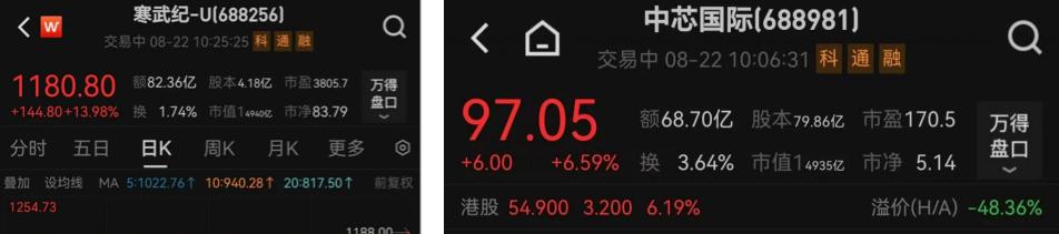 就在8月22日,寒武紀盤中大漲近14%,總市值超4940億元,首次超過中芯國際,躍居科創板市值第一。