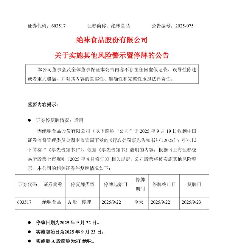 根據《上海證券交易所股票上市規則(2025年4月修訂)》相關規定,絕味食品股票將被實施其他風險警示。停牌日期定為2025年9月22日,實施起始日為2025年9月23日,實施后公司A股簡稱將由“絕味食品”變更為“ST絕味”。