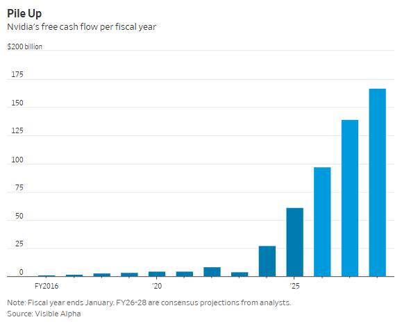 FactSet的數(shù)據(jù)顯示,英偉達過去四個財季累計創(chuàng)造了多達720億美元自由現(xiàn)金流,本財年末有望突破1000億美元大關(guān)。