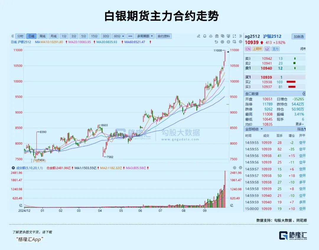 截至收市,黃金期貨主力合約上漲1.35%,收報866.52元/克,創下歷史新高;白銀期貨主力合約大漲3.92%,收報10939元/克,也突破了新高。