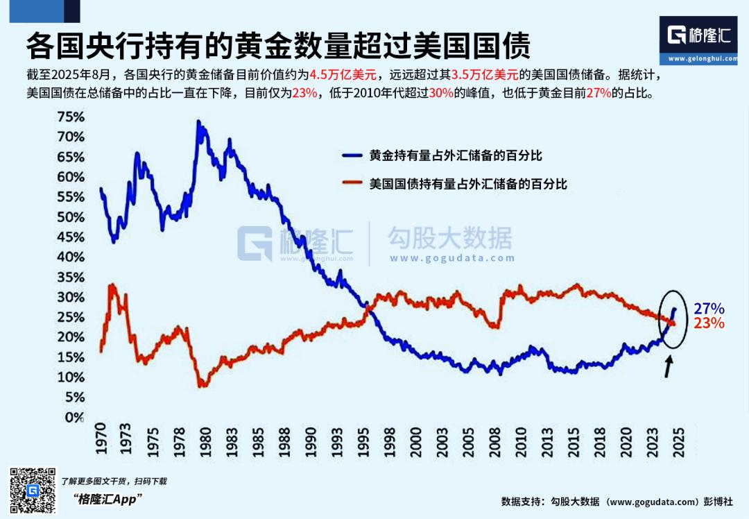 從資金層面來看,近年來,不僅是商業機構在買入黃金,全球各國央行也在大舉下場買入黃金。截至2025年8月,各國央行的黃金儲備目前價值約為4.5萬億美元,已經遠遠超過其3.5萬億美元的美國國債儲備。據統計美國國債在總儲備中的占比一直在下降,目前僅為23%,低于2010年代超過30%的峰值,也低于黃金目前27%的占比。