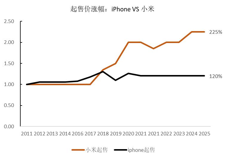 小米手機(jī)的十余代產(chǎn)品以來,從一開始的性價(jià)比定位到高端定位,其手機(jī)定價(jià)步步高升,甚至超過了蘋果的同期漲幅。與此同時(shí),尤其近五年來,蘋果則“加量不加價(jià)”。