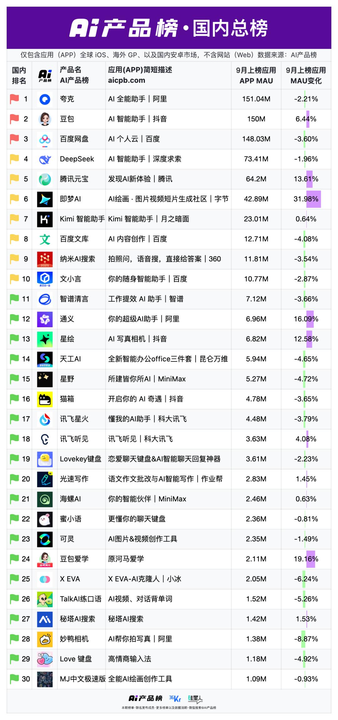 前三名毫無懸念:夸克、豆包、百度網盤。唯一闖進前十的創業公司,只有DeepSeek和Kimi。