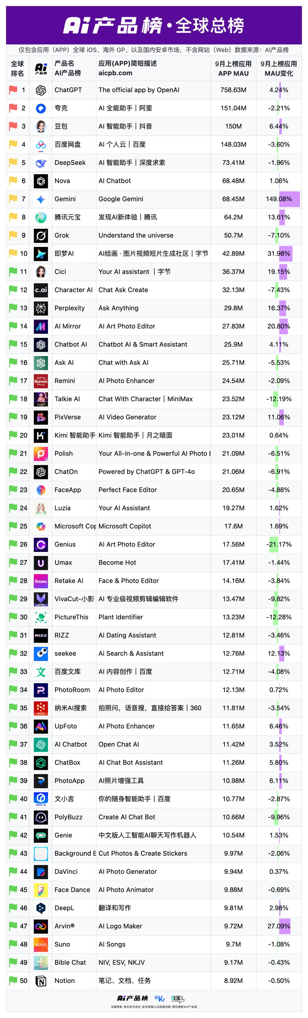 而在國內,排在前三的產品的MAU均在1.5億,分別來自阿里、字節和百度。即使在原生AI應用上,豆包的MAU也大概為DeepSeek的2倍,遠遠沒有達到ChatGPT的領先程度。