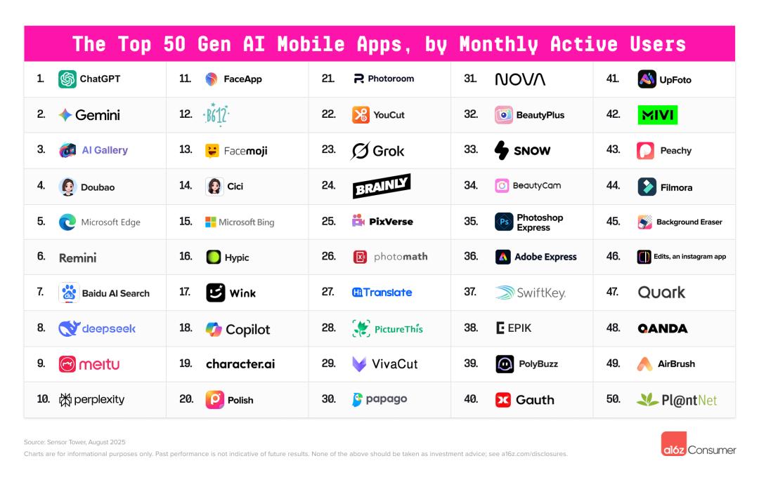 全球榜單上共有34個非中國產品,但只有5個屬于“大廠”,占比只有15%,比如ChatGPT(OpenAI)、Gemini(Google)、Grok(X)、Character.AI(Google)和Microsoft Copilot。其他幾乎全是Perplexity、PhotoRoom這樣的小團隊或創業公司。
