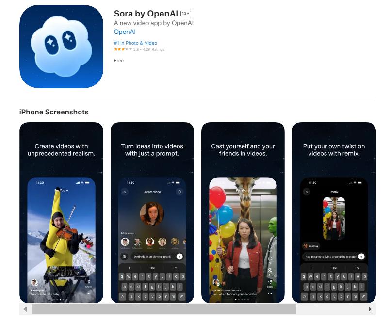 Sora App上線第四天,就拿下了蘋果美國應用商店App Store的免費應用榜第一名,超越了Gemini和ChatGPT,堪稱“出道即頂流”。