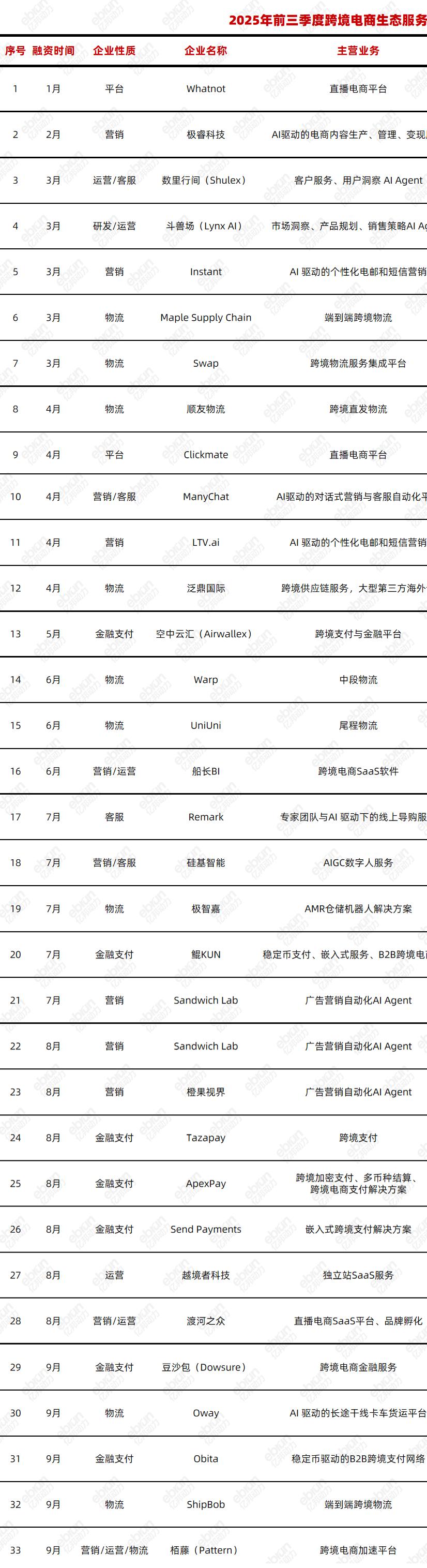 據億邦動力不完全統計,2025年前三季度,包括各類細分服務類型(平臺、建站、營銷、運營、物流、金融支付、客服)在內,跨境電商生態服務領域共發生至少33起投融資活動,涉及32家出海企業以及兩次IPO事件。