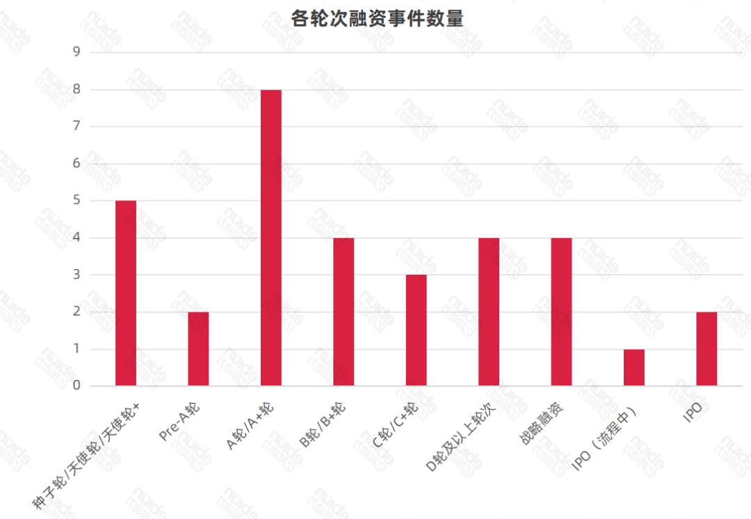 具體而言,種子輪/天使輪/“天使輪+”共計5起,Pre-A輪/A輪/A+輪共計10起,B輪/B+輪共計4起,C輪/C+輪共計3起,其他更高輪次的融資共計4起,戰略融資共計4起,處于IPO流程中的項目共計1起,IPO成功上市融資共計2起。其中,成長期企業(Pre-A輪、A輪、B輪和C輪)的融資事件占比超50%。