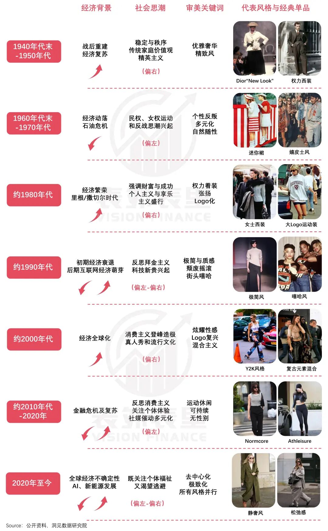 從更長的維度看,時尚也是一種周期輪回:當經濟上行、保守主義占上風時,權力、地位開始主導審美;而經濟動蕩、社會思潮強調公平時,時尚則化身個人自由表達的載體,包容與舒適成為新美學。