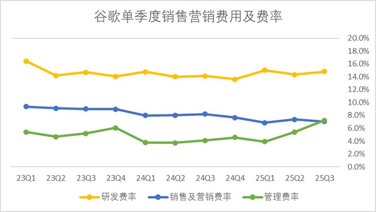 管理費用三季度有一筆訴訟一次性支出,扣除后也維持在4%左右,整體來看谷歌的費控水平還不錯,也能從側面印證三季度業績表現驅動力不僅僅是市場投入。