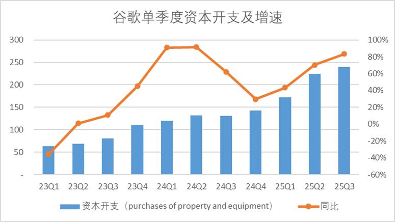 同時,三季度谷歌的資本開支錄得240億美元,高基數下同比再增83%,超過了市場預期,今年以來整體的資本開支規模達到了636億。