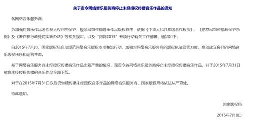 這種長期無序的狀態不僅阻礙了行業的健康發展,也最終引來監管的強力介入。國家版權局于2015年7月發布《關于責令網絡音樂服務商停止未經授權傳播音樂作品的通知》,要求所有平臺在規定期限內下架未經授權內容,并提交整改報告。