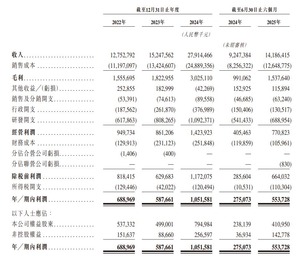 上述操作讓立景創(chuàng)新的業(yè)務(wù)體量不斷增大。招股書顯示,2022年、2023年、2024年及2025年上半年,立景創(chuàng)新收入分別為127.53億元、152.48億元、279.14億元及141.86億元;毛利分別為15.56億元、18.23億元、30.25億元及15.38億元;年內(nèi)利潤分別為6.89億元、5.88億元、10.52億元及5.54億元。