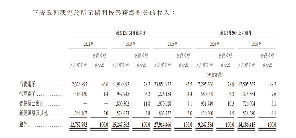 招股書顯示,立景創(chuàng)新的收入主要來自銷售消費(fèi)電子產(chǎn)品,包括應(yīng)用于智能手機(jī)、筆記本計(jì)算機(jī)及平板計(jì)算機(jī)的攝像頭模塊。2022年、2023年、2024年及2025年上半年,立景創(chuàng)新來自核心的消費(fèi)電子業(yè)務(wù)的營收分別為123.25億元、119.19億元、238.55億元及125.06億元,分別占各期間總收入的96.6%、78.2%、85.5%及88.2%。
