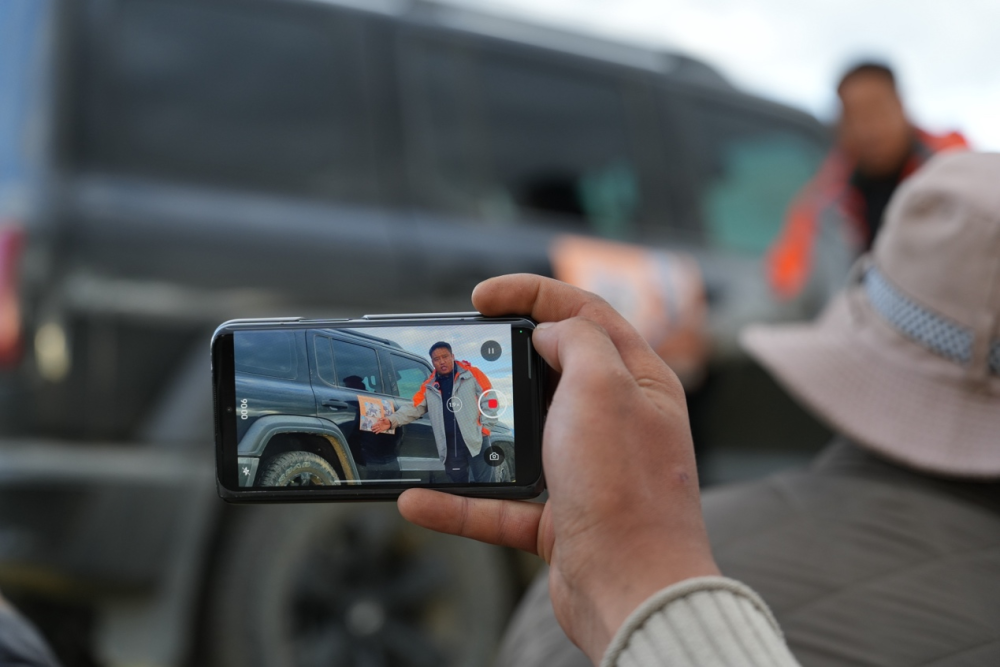 圖為牧民用手機認真記錄政策內容。 何欣然攝