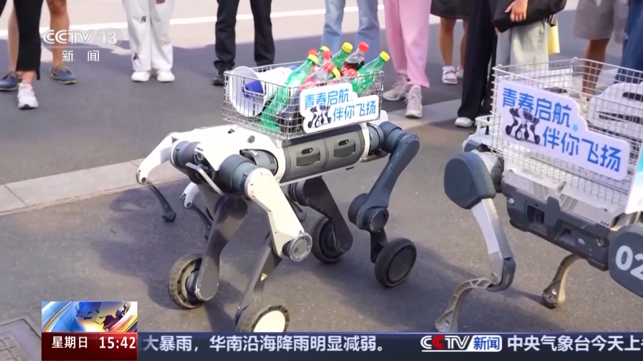 智能迎新小隊(duì)工作人員 何霖:它們一個(gè)是腿足式的,一個(gè)是輪足式的。輪足式的移動(dòng)速度要更快,腿足式的承載能力更高,能夠負(fù)載40公斤,幫新生們、家長們減輕運(yùn)送行李的壓力。