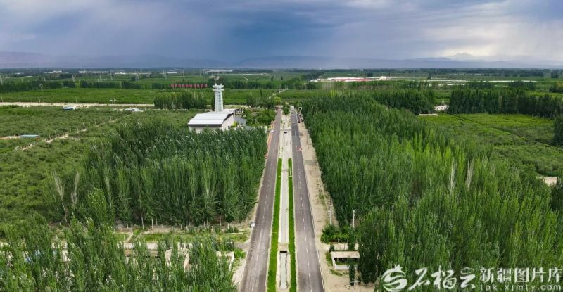 2023年拍攝到的柯柯牙荒漠綠化工程,道路左側建筑為柯柯牙紀念館。楊碩攝