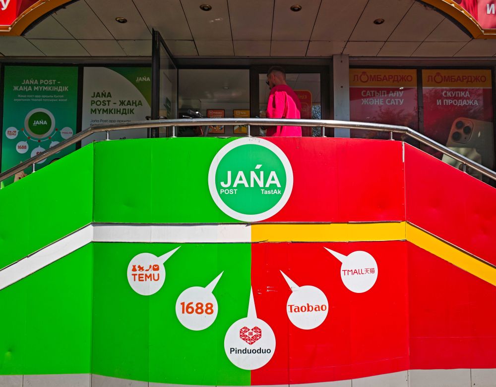這是9月3日在哈薩克斯坦阿拉木圖一家主要負責中國網購平臺物流服務的快遞網點外拍攝的宣傳標識。(新華社記者李任滋攝)