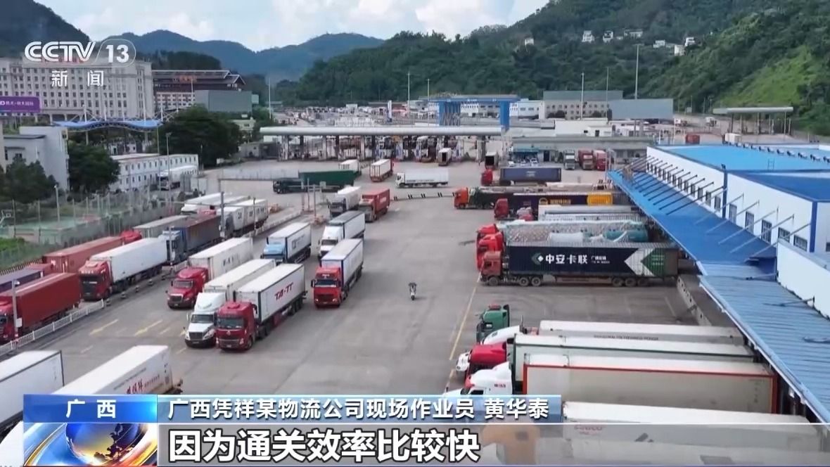 廣西憑祥某物流公司現場作業員 黃華泰:我們公司主要從事菠蘿蜜、芒果等東盟水果的進口,因為通關效率比較快,不少客戶都愿意從這里進口。今年前8月我們在這里順利通關了近3000柜的貨物,這些東盟國家水果主要銷售到廣東、浙江等地。