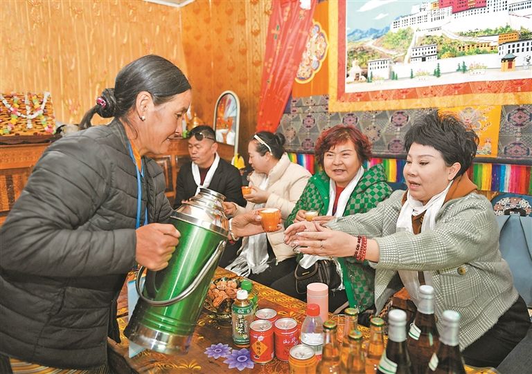 山南市乃東區扎西曲登社區的112號民宿主人剛組為游客們倒上熱乎的酥油茶。記者 旦增蘭澤 洛桑 唐斌 攝