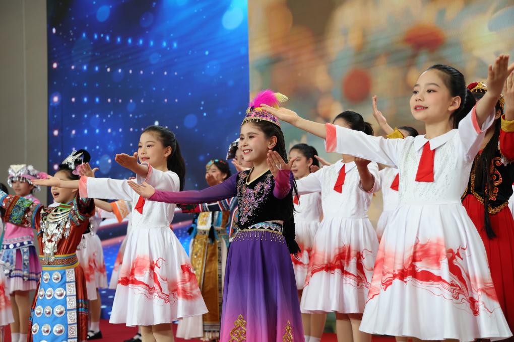 10月14日,全球婦女峰會配套活動“數智賦能婦女和女童成果展”在中國婦女兒童博物館開展。春蕾夢想合唱團的孩子們在展覽現場演唱《花開中國》。新華社記者 梁旭 攝