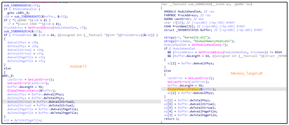 圖 module13(左)與Memory_Target.dll(右)代碼同源性對(duì)比