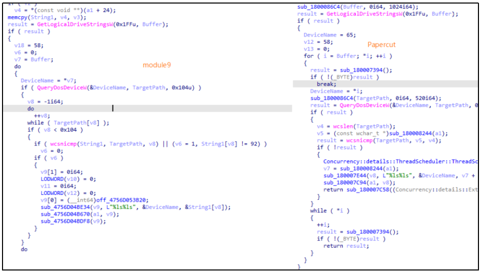 圖 module9(左)與Papercut_Target.dll(右)代碼同源性對(duì)比