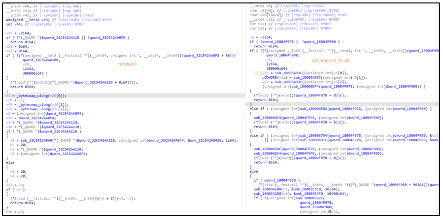 圖 module0(左)與Dsz_Implant_Pc.dll(右)代碼同源性對(duì)比