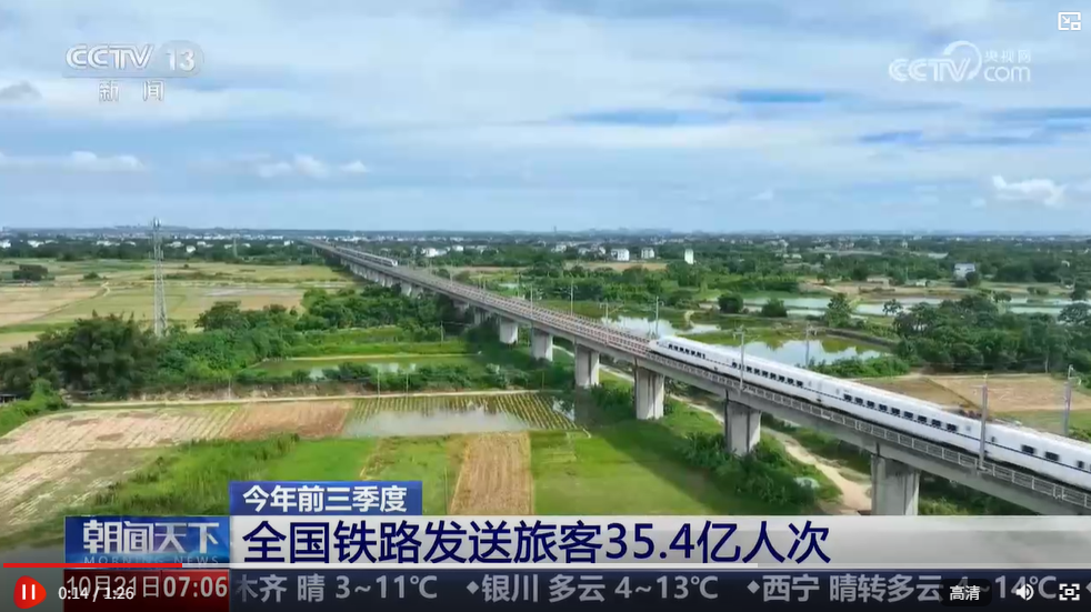 央視網(wǎng)消息:記者從國鐵集團(tuán)了解到,今年前三季度,全國鐵路發(fā)送旅客35.4億人次,同比增長6%,再創(chuàng)歷史同期新高。