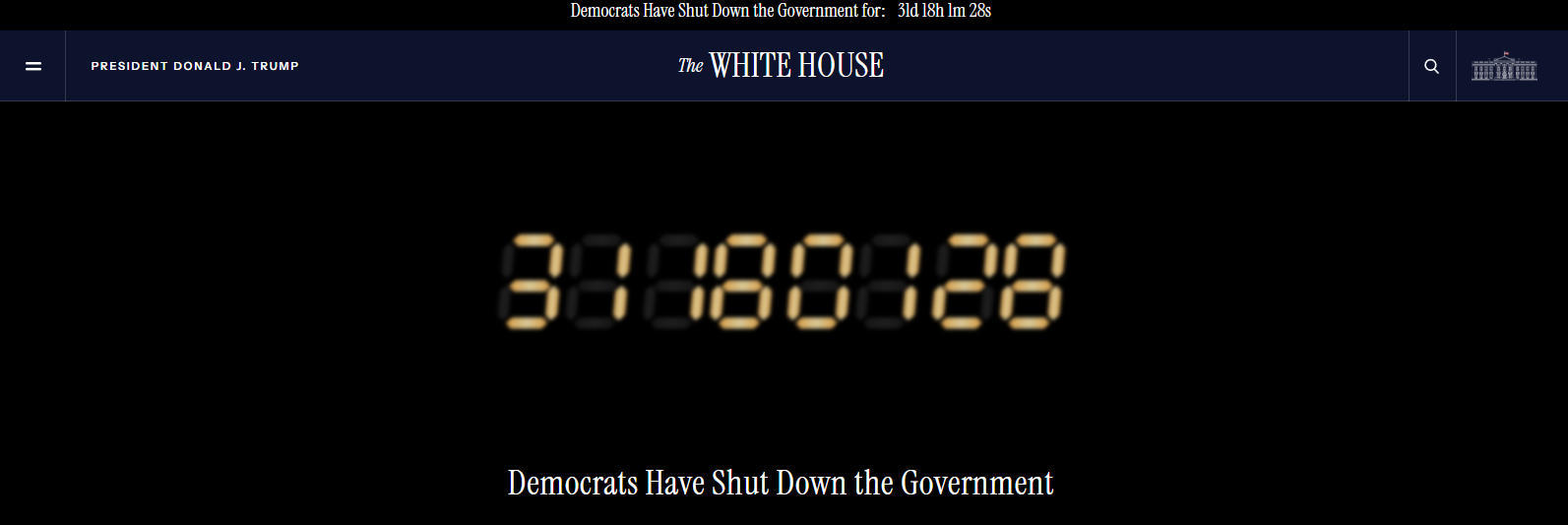 截至美東時(shí)間11月1日18時(shí)(北京時(shí)間11月2日6時(shí)),美國白宮官網(wǎng)實(shí)時(shí)刷新紀(jì)錄的這次美國政府“停擺”已經(jīng)持續(xù)了31天零18個小時(shí)。在白宮官網(wǎng)的頁面上,寫有“民主黨人關(guān)停了政府”的字樣。