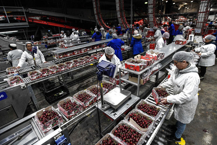在智利莫斯塔薩爾的一座吉制公司工廠,工作人員處理車厘子(2024年12月13日攝)。新華社發(豪爾赫·比列加斯攝)