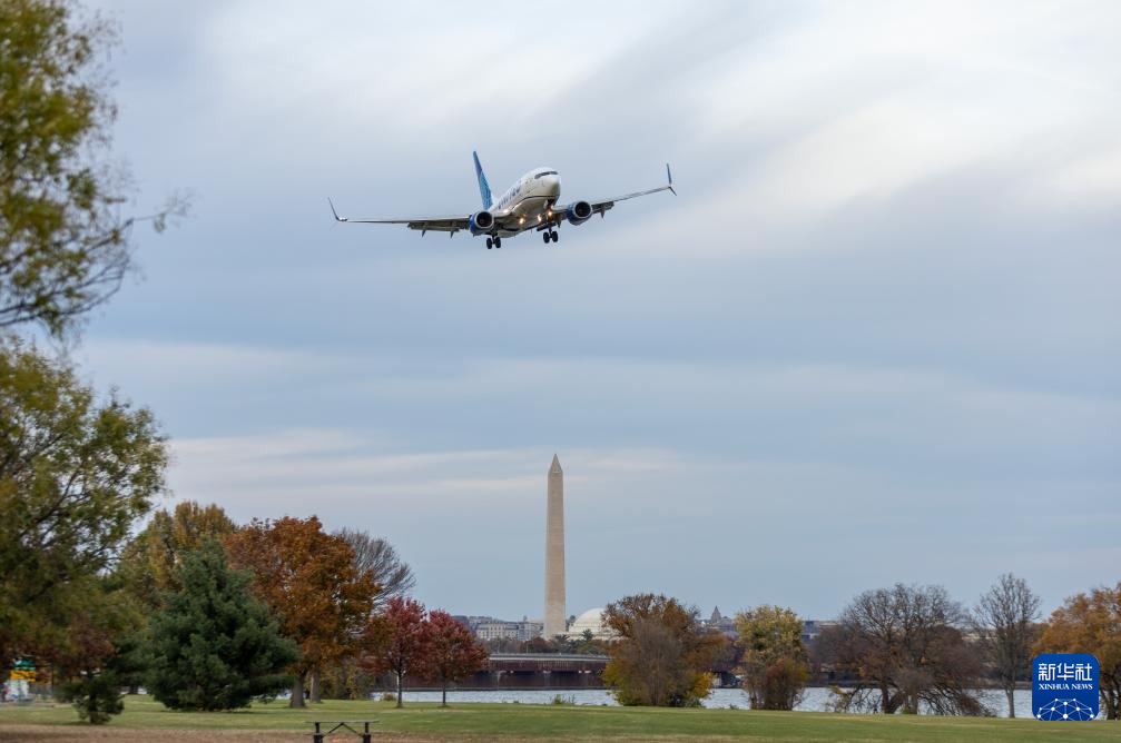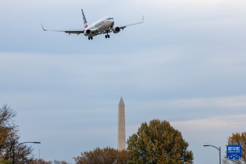 11月7日,一架美國航空公司飛機(jī)準(zhǔn)備降落在美國弗吉尼亞州阿靈頓的里根國家機(jī)場。新華社記者 胡友松 攝