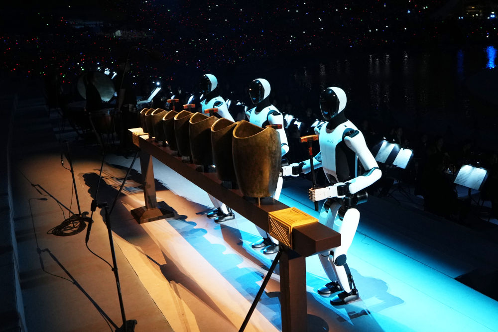 開幕式表演中的這一幕給觀眾留下深刻印象——三個工業人形機器人敲響千年前的中國古代樂器青銅句鑃,展開了一場未來與歷史的對話。談到此創意,十五運會開幕式藝術總監陳維亞表示:“這一點我們很自信,抓得好、抓得精彩、抓得有特色。”