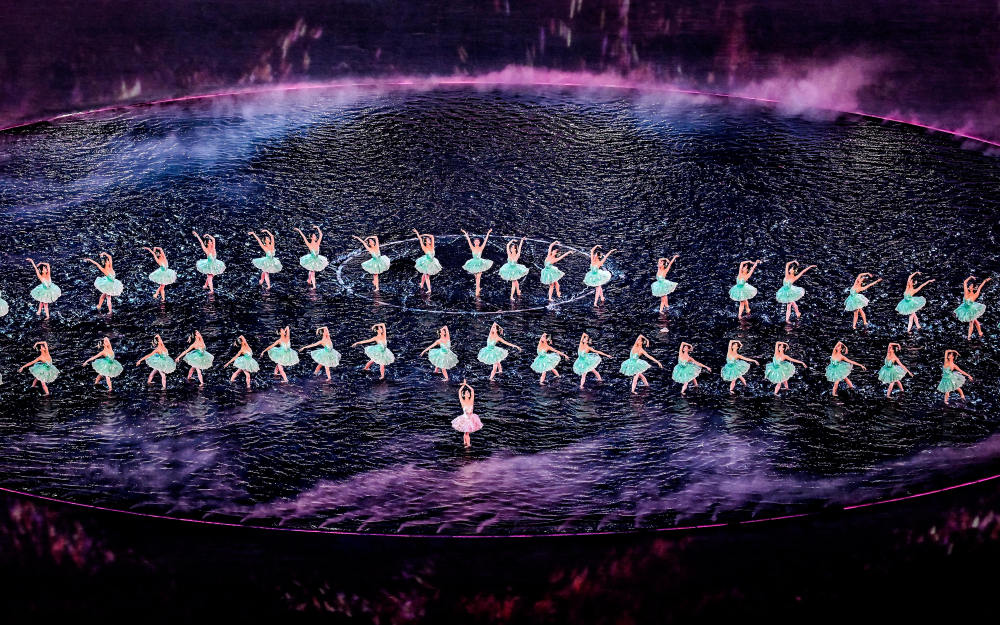 郎昆介紹,開幕式在空間敘事、藝術表達等方面都體現了三地文化交融。主舞臺直觀呈現“同心圓”造型,環形舞臺周邊是廣闊的水面,運用前沿的“虛實結合”技術,讓珠江、維多利亞港、伶仃洋的水波在場地中交匯奔流。這不僅是地理水系的相連,更是三地同源共流的文化血脈與手足親情的象征。